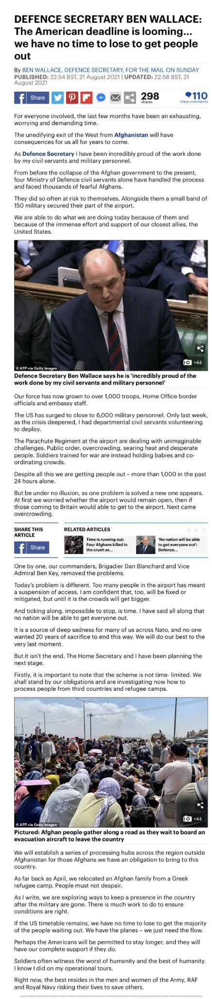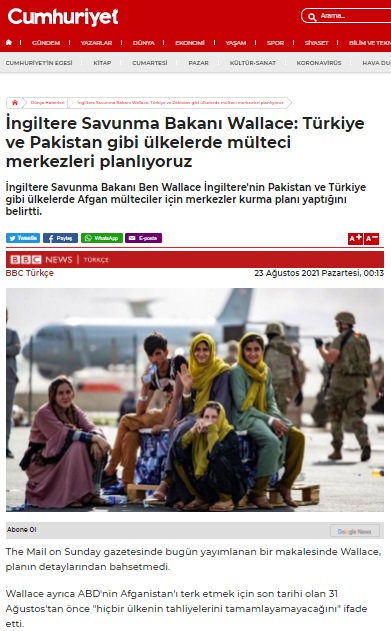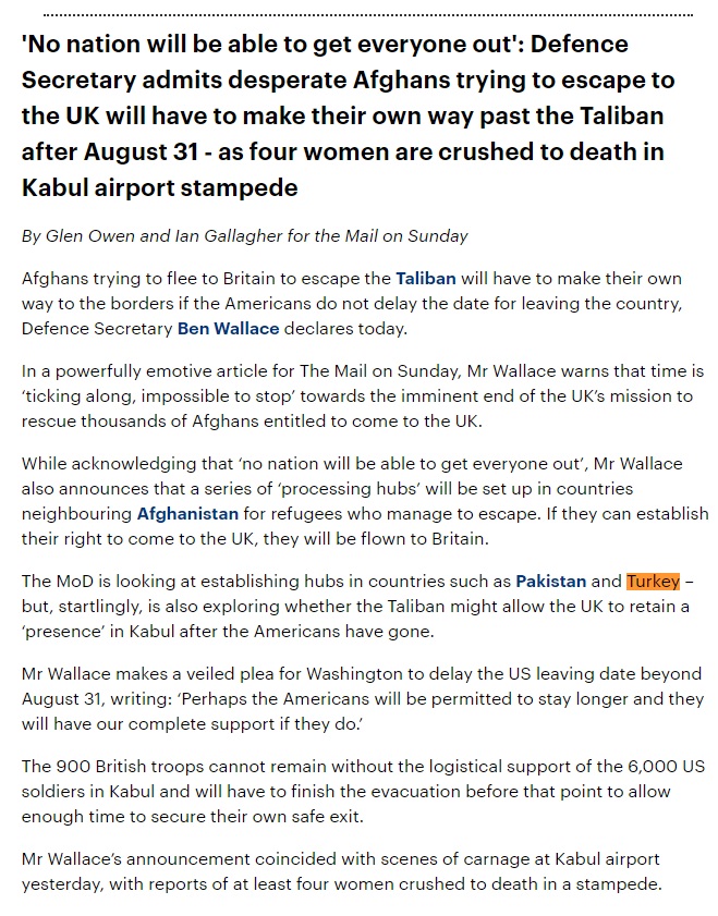 “Pazar günü de Mail on Sunday gazetesi İngiltere Savunma Bakanı Ben Wallace’ın Afganistan’dan çıkarılmaya çalışılan Afgan mültecilerle ilgili bir makalesini yayımlamış, buna ek olarak da Savunma Bakanı’nın makalesindeki bazı sözlerini de içeren ayrı bir haber yapmıştır.