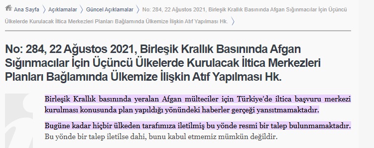 Dışişleri Bakanlığımız yayımladığı basın açıklamasında Afgan mülteciler için Türkiye’de iltica başvuru merkezi kurulması konusunda plan yapıldığı yönündeki haberlerin gerçeği yansıtmadığını belirtmişti.