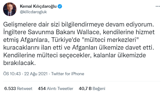 “Gelişmelere dair sizi bilgilendirmeye devam ediyorum. İngiltere Savunma Bakanı Wallace, kendilerine hizmet etmiş Afganlara, Türkiye’de “mülteci merkezleri” kuracaklarını ilan etti ve Afganları ülkemize davet etti. Kendilerine mülteci seçecekler, kalanlar ülkemizde bırakılacak.”