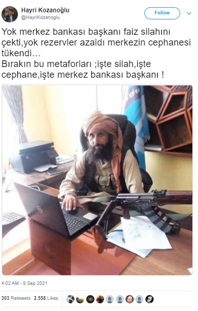 Gerektiğinde elindeki bütün silahları kullanacak“, “faiz silahını çekinmeden kullanır“, “kuru sıkı para politikasında kararlı“, “cephanesi tükenmez” gibi nüktelerle sosyal medyada Afganistan Merkez Bankası’nın yeni başkanına ait sanılarak paylaşılan fotoğrafı konu edineceğiz.