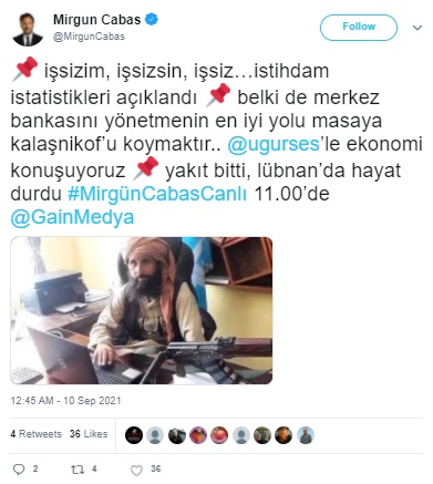 “Afganistan Merkez Bankası Başkanı Hacı Muhammed İdris. Enflasyona karşı her türlü aracı kullanacak sanki 🙂 Ne demişti Draghi? “Whatever it takes”. Sonrasında bazukalı illüstrasyonlar yayımlanmıştı. İdris dersine çalışmış (!) görünüyor. Neydi o motto? ‘The medium is the message'”
