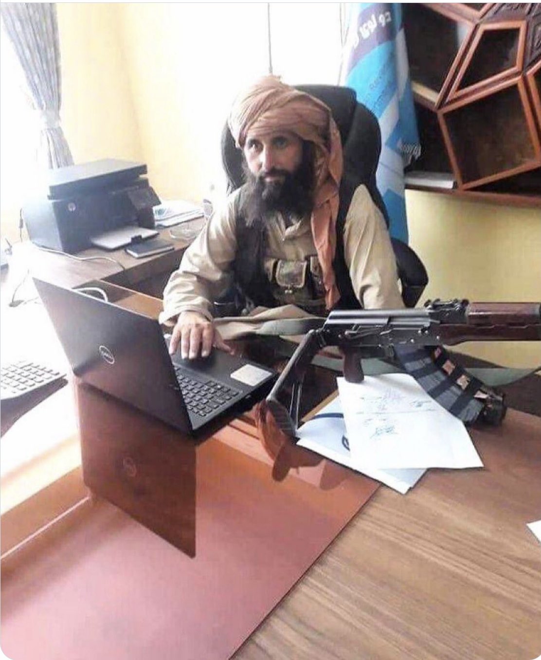 Afganistan’ın yeni merkez bankası başkanına ait sanılan ofiste diz üstü bilgisayarın yanında AK-47 Kalaşnikof silahıyla görüntülenen sarıklı şahsa ait fotoğraf şu şekilde:
