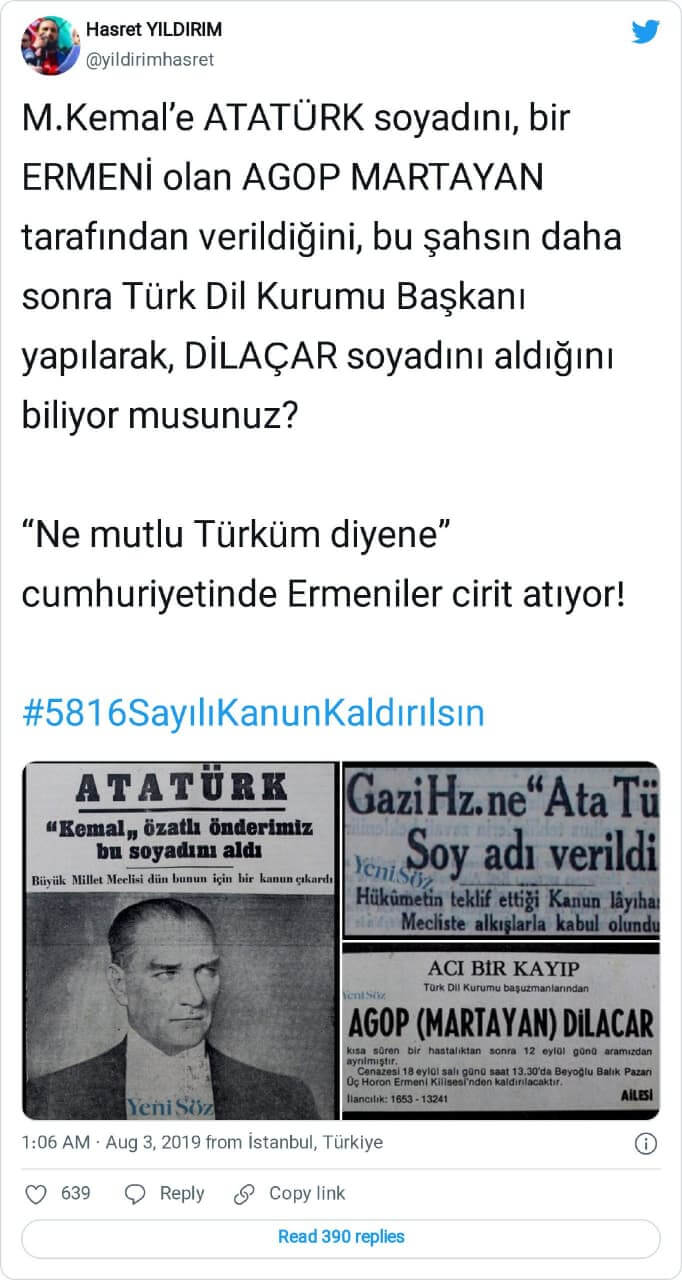 “M.Kemal’e ATATÜRK soyadını, bir ERMENİ olan AGOP MARTAYAN tarafından verildiğini, bu şahsın daha sonra Türk Dil Kurumu Başkanı yapılarak, DİLAÇAR soyadını aldığını biliyor musunuz? “Ne mutlu Türküm diyene” cumhuriyetinde Ermeniler cirit atıyor! #5816SayılıKanunKaldırılsın”