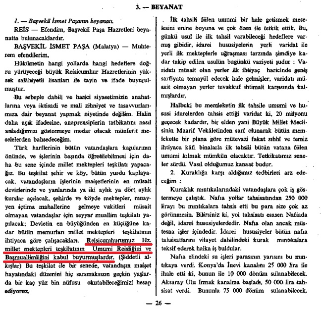 “Türk harflerinin bütün vatandaşlara kapılarının önünde, ve işlerinin başında öğretilebiimesi için daha bu sene içinde millet mektepleri teşkilatı yapacağız. Bu teşkilat şehir ve köy, bütün yurdu kaplayacak, vatandaşların işlerinin maişetlerinin en müsait devirlerinde ve yanlarında ya iki aylık ya dört aylık kurslar açılacak, şehirde ve köyde mektepler, muayyen içtima mahallerine gelmeye vakitleri müsait olmayan vatandaşlar için seyyar muallim teşkilatı yapılacak; Devletin en büyüğünden en küçüğüne kadar bütün memurları millet mektepleri teşkilatının ihtiyaca göre çalışacakları. Reisicumhurumuz Hz. millet mektepleri teşkilatının Umumi Reisliğini ve Başmuallimliğini kabul buyurmuşlardır.“