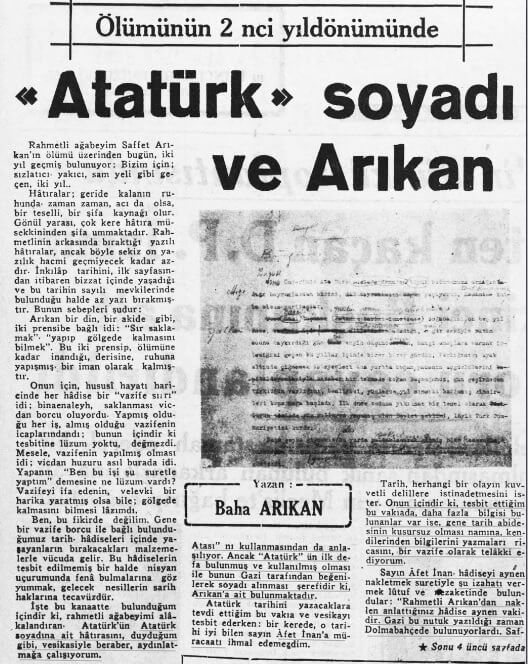 Saffet Arıkan’ın vefatının ardından kardeşi Baha Arıkan tarafından kaleme alınan ve Ulus gazetesinde 26 Kasım 1949 tarihinde yayımlanan “Atatürk Soyadı ve Arıkan” başlıklı yazıda Atatürk soyadını Saffet Arıkan’ın buluşu şu şekilde aktarılmıştı: