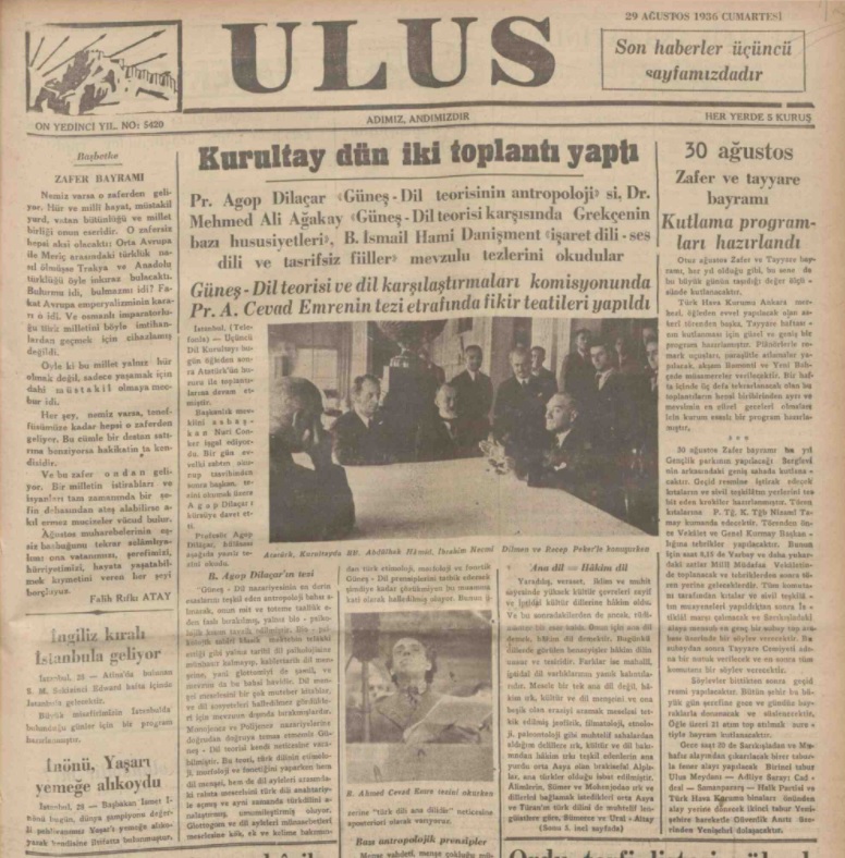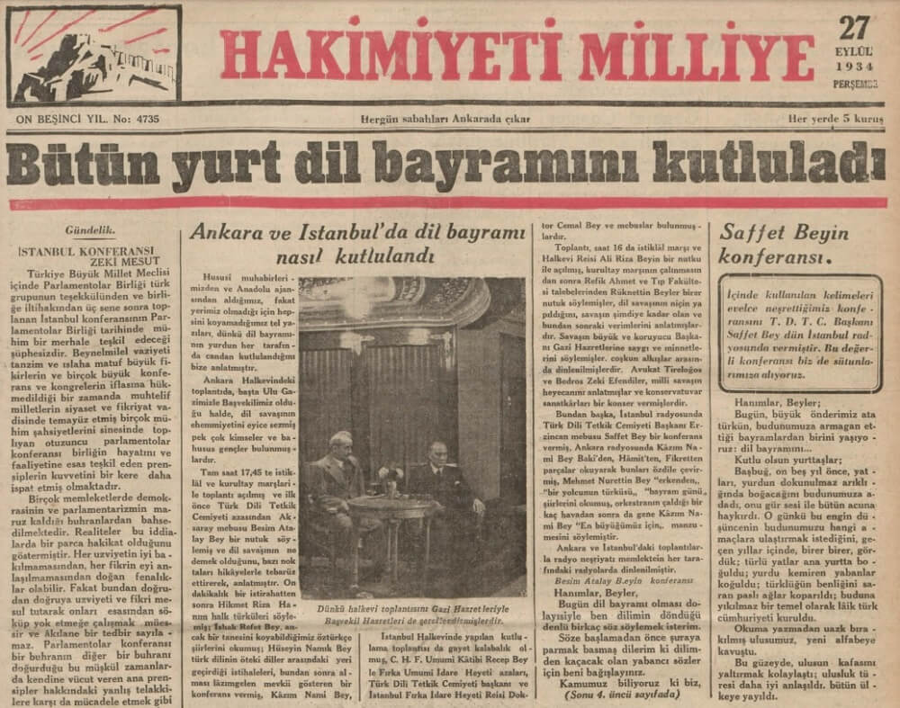 “Hanımlar, Beyler; Bugün, Büyük önderimiz atatürkün, budunumuza armagan ettiği bayramlardan birini yaşıyoruz: dil bayramını … Kutlu olsun yurttaşlar; Başbuğ, on beş yıl önce, yatları, yurdun dokunulmaz arıklığında boğacağını budunumuza adadı, onu gür sesi ile bütün acuna haykırdı. O günkü bu engin düşüncenin budunumuzu hangi amaçlara ulaştırmak istediğini, geçen yıllar içinde, birer birer, gördük; türlü yatlar ana yurtta boğuldu; yurdu kemiren yabanlar koğuldu; türklüğün benliğini saran paslı ağlar koparıldı; buduna yıkılmaz bir temel olarak laik türk cümhuriyeti kuruldu. Okuma yazmadan uzak burakılmış ulusumuz, yeni alfabeye kavuştu. Bu güzeyde, uluaun kafasını yaltırmak kolaylaştı; ulusluk türesi daha iyi anlaşıldı. bütün ülkeye yayıldı. Budunumuzun öz benliğini bilmesi için en güvenli açar, bilirsiniz, gerçek ulus tarihidir. Bu en değerli gömüç; özlüğünden uzaklaşmış, gerçeğe karşı gözleri kepenklenmiş kişilerin yat bitiklerden topladıklan dipsiz, değersiz işin yürüyeceğine ve dilimizin artık en medeni diller arasına gireceğine kimsede tereddüt kalmamıştı. …”