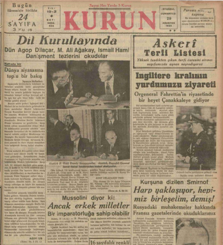 Maarif Vekili Reşit Galip Kurultay’ı açış konuşmasında, Türk Dili Tetkik Cemiyeti’nin amacını bu sözlerle belirtir. Yıl 1932, 26 Eylül, Pazartesi, Dolmabahçe Sarayı, Muayede Salonu. Kurultay’ın açılış günü Agop Martayan sarayın giriş salonunda beklerken, birden içeri Mustafa Kemal girer. Yanında İsmet İnönü ve diğer çalışma arkadaşları vardır. Tanıdığını belirtir bir biçimde kafasını sallar. Bu, Mustafa Kemal’i ikinci görüşü olur. O’nun vefatına kadar da daima Atatürk’ün yanında olur.