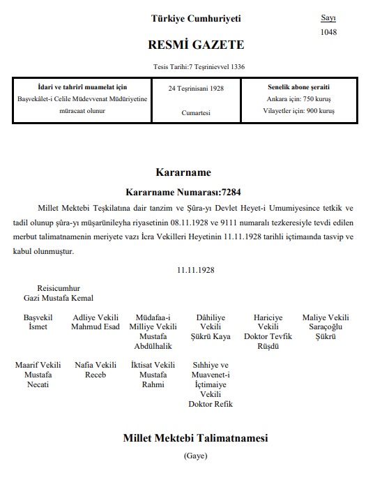 Millet Mektebinin işleyişine dair kararname, 24 Kasım 1928 tarihinde Resmi Gazete‘de yayınlanarak yürürlüğe girmişti (Öğretmenler Günü her yıl 24 Kasım’da Atatürk’ün başöğretmenlik sıfatını kabulünün yıl dönümünde değil, Millet Mektebi Talimatnamesinin yürürlüğe girdiği tarihin yıl dönümünde kutlanmaktadır).