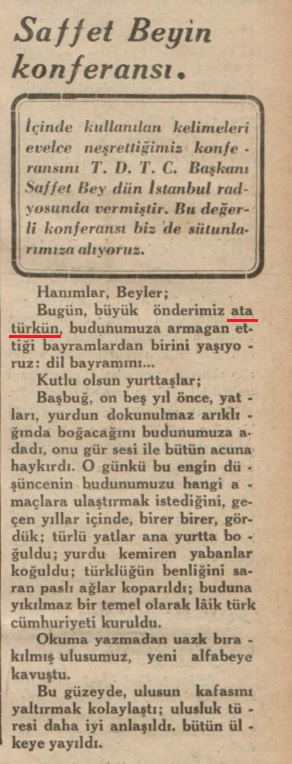 “Atatürk’ün istemiyle 12.07.1932’de kurulan Türk Dili Tetkik Cemiyeti’nin Başkanı Saffet Arıkan’ın, Birinci Türk Dil Kurultayı’nın açıldığı 26.09.1932 günü, İstanbul radyosunda bir konuşma yapmış; bu konuşmanın metni, ertesi gün Hakimiyeti Milliye gazetesinde yayımlanmıştı: “Hanımlar, Beyler. Bugün, büyük önderimiz ata türkün, budunumuza armağan ettiği bayramlardan birini yaşıyoruz: dil bayramını… Kutlu olsun yurttaşlar…” İşte Atatürk sözcüğü, Mustafa Kemal’in bu soyadını almasından yaklaşık iki ay önce ilk kez Saffet Bey’in bu radyo konuşmasında kullanılmıştı.