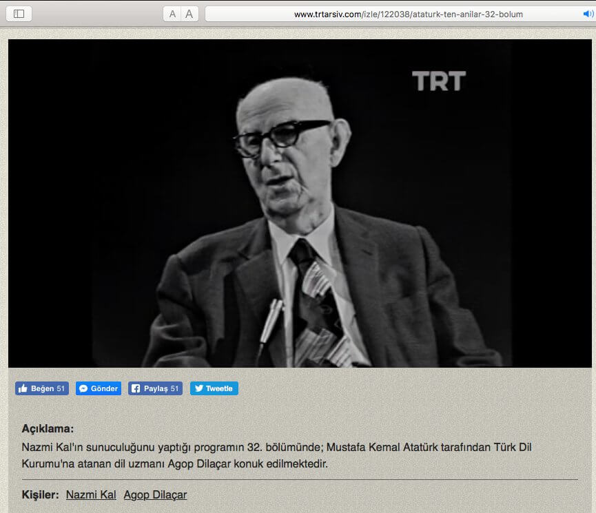 “Agop Martayan Dilaçar 1979’da öldüğünde TRT’nin bu haberi AGOP dememek için A.DİLAÇAR (Adil Açar) diyerek duyurduğunu yazmışsınız. Bu sol maskeli etnik ayrılıkçılarca yayılmış bir yalandır. TRT 1979’da ondan AGOP adıyla sözetmiştir.”