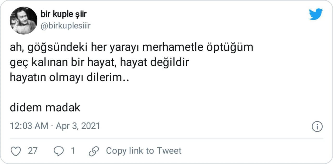 Bugün Osman Konuk’un ifadesiyle “hayatı ve şiiri sahici bir kendini gerçekleştirme ve bunun cömertçe şiire sunma hikâyesi” olarak gören Didem Madak’a (8 Nisan 1970- 23 Temmuz 2011) (hatalı şekilde) izafe edilen “Ah, Göğsündeki her yarayı merhametle öptüğüm. Geç kalınan hiçbir hayat, hayat değildir. Hayatın olmayı dilerdim.” sözlerini ele alacağız.
