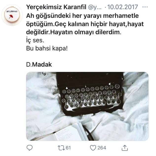 Didem Madak’a ait olarak yaygın bir biçimde paylaşılan sözlerin ilk olarak Tuğba Karademir’in Tumblr hesabında paylaşıldığını görüyoruz. Bir kadının ağzından mektup türünde oluşturduğu metni Madak’tan “Ah’lar Ağacı” şiirinin bir kısmının alıntılayarak tamamlar Karademir.