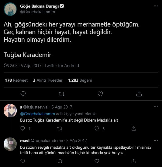 Sosyal medyada bahse konu ifadelerin Tuğba Karademir’e atfedilerek aktarıldığı paylaşımlarla da karşılaşıyoruz (Karademir’in “bu sözün sevgili madak’a ait olduğunu bir kaynakla ispatlayabilir misiniz? telifi bana ait çünkü. madak’ın hiçbir kitabında yok bu yazı.” ifadesiyle sözün şahsına ait olduğunu belirttiği görülebiliyor (Sözlerin asıl sahibinin ismiyle paylaşılmasına müdahalede bulunan okurların olması dikkat çekici)).