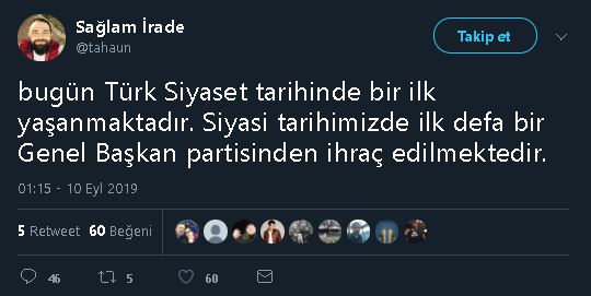 Ancak Ahmet Davutoğlu’nun 2014–2016 yılları arasında genel başkanlığını üstlendiği AK Parti’den ihraç edilmesi, Türk siyasi tarihinde bir ilki oluşturmayacak. Çünkü, Ahmet Davutoğlu’nun genel başkanlık yaptığı partiden ihracının öncesinde bir isim aynı deneyimi yaşamıştı: İçişleri Bakanı Süleyman Soylu.