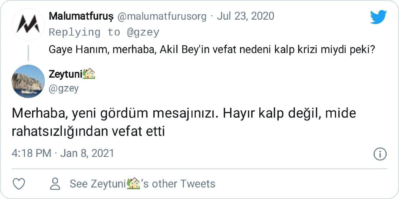 “Merhaba, yeni gördüm mesajınızı. Hayır kalp değil, mide rahatsızlığından vefat etti”