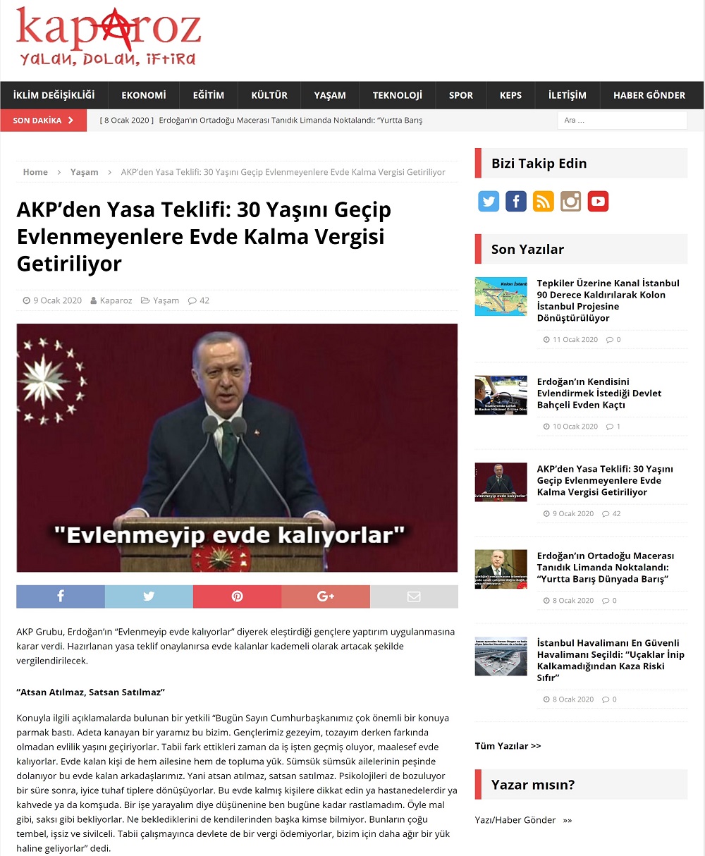 Kaparoz.com’un 9 Ocak 2020 tarihinde yayınladığı “AKP’den Yasa Teklifi: 30 Yaşını Geçip Evlenmeyenlere Evde Kalma Vergisi Getiriliyor” başlıklı yazısında “AKP Grubu, Erdoğan’ın “Evlenmeyip evde kalıyorlar” diyerek eleştirdiği gençlere yaptırım uygulanmasına karar verdi. Hazırlanan yasa teklif onaylanırsa evde kalanlar kademeli olarak artacak şekilde vergilendirilecek” sözleriyle bu iddiayı mizahî bir dille parodi haber şeklinde paylaşmıştı.