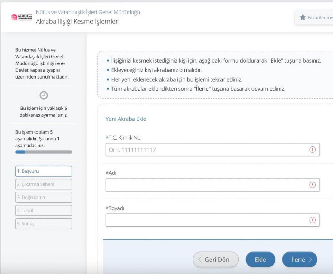 E-Devlet sayfası formatında “Akraba İlişiği Kesme İşlemleri” başlığını taşıyan “İlişiğinizi kesmek istediğiniz kişi için aşağıdaki formu doldurarak ‘Ekle’ tuşuna basınız. Ekleyeceğiniz kişi akrabanız olmalıdır. Her yeni eklenecek akraba için bu işlemi tekrar ediniz. Tüm akrabalar eklendikten sonra ‘İlerle’ tuşuna basarak devam ediniz.” açıklamasını içeren görsel şu şekilde: