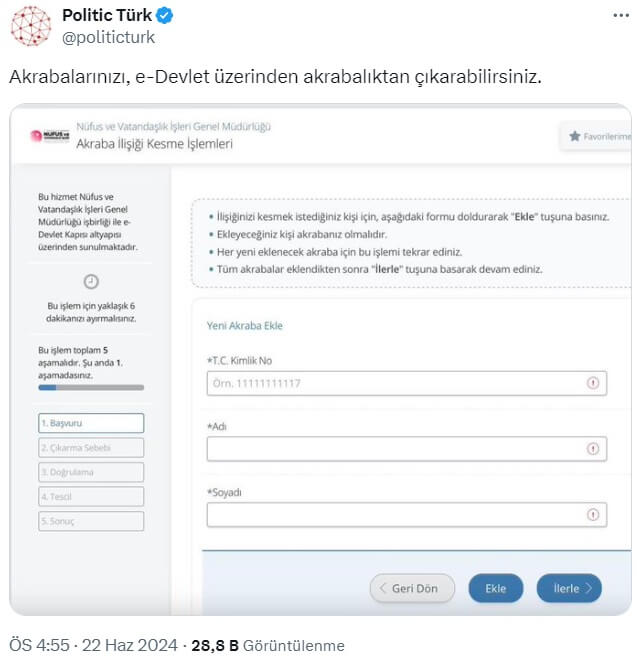 Muhbir (ajans_muhbir) & Politic Türk (@politicturk): “Akrabalarınızı, e-Devlet üzerinden akrabalıktan çıkarabilirsiniz.”