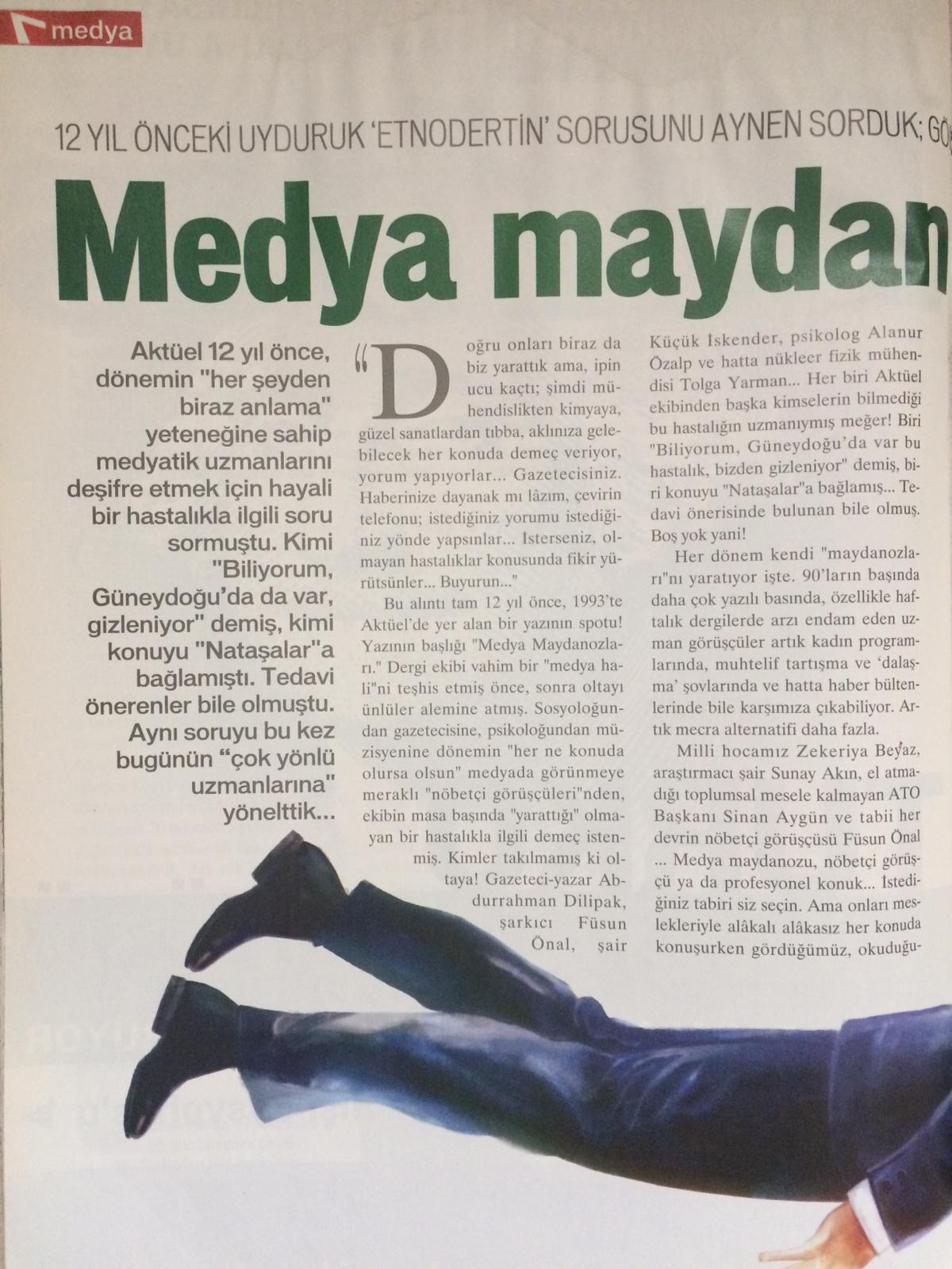 1993 yılında Aktüel Dergisi, var olmayan bir hastalık uydururarak ilgili dönemin kamuoyunca bilinen yazarlarına bu hastalık hakkında fikirlerini sormuştu. “Etnik” ve “dert” sözcüklerinin birleşiminden oluşan hayali “etnodertin” bir cilt hastalığının Karadeniz Bölgesi’nde görüldüğünü, araştırmanın Hacettepe Üniversitesi tarafından yapıldığını belirterek, hastalık hakkında telefonla malumatfuruşların görüşlerini talep etmişti. Ülkemiz basınının önde gelen simaları “bilmiyorum” demek yerine malumatfuruşluk yapmayı tercih edince oltaya düşmüşlerdi. Aktüel, 20 Mayıs 1993 tarihli 98. sayısında yayımlanan “Medya Maydanozları” başlıklı yazıda bu isimleri ifşa etmişti.