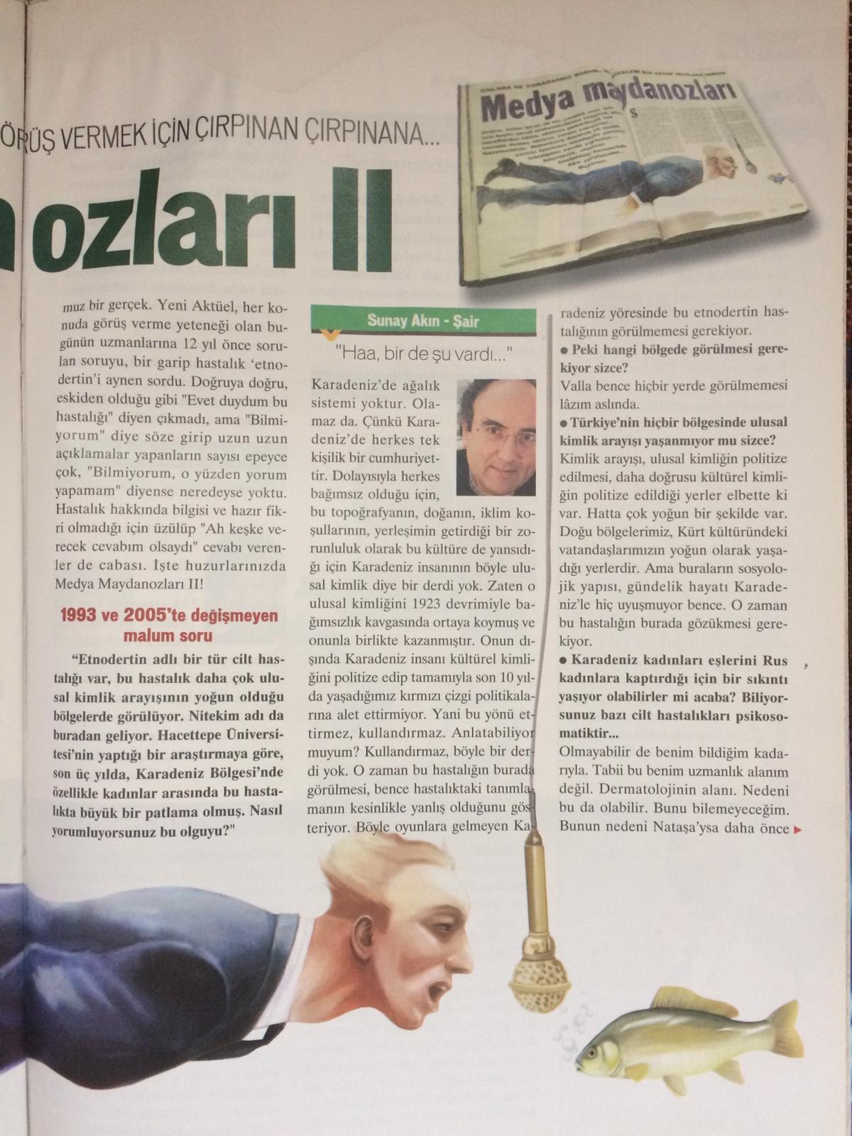 “Etnodertin adlı bir tür cilt hastalığı var, bu hastalık daha çok ulusal kimlik arayışının yoğun olduğu bölgelerde görülüyor. Nitekim adı da buradan geliyor. Hacettepe Üniversitesi’nin yaptığı bir araştırmaya göre son 3 yılda Karadeniz Bölgesi’nde özellikle kadınlar arasıda bu hastalıkta büyük bir patlama olmuş. Nasıl yorumluyorsunuz bu olguyu?