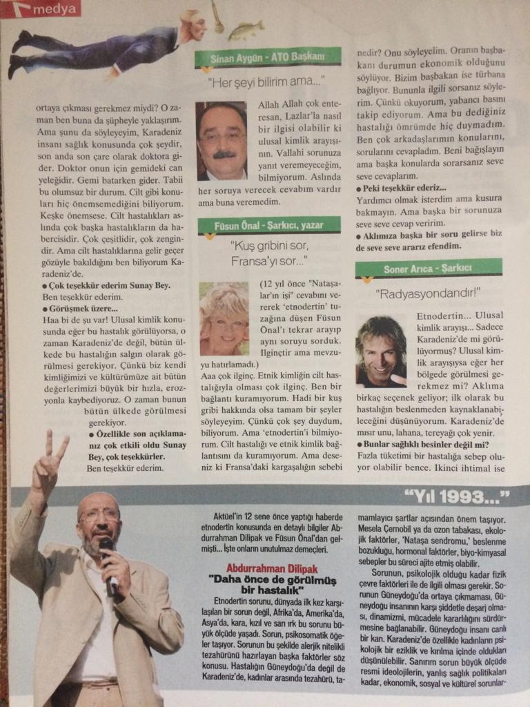 “Gelelim şu ETNODERTİN hadisesine. Yıl: 1993. SSCB dağılmış. Gürcistan’dan Karadeniz’e yoğun girişler var. Basında o günlerde NATAŞA Sendromundan söz ediliyor. Hâlâ konu taverna şarkılarına yansımış, mizah konusu olmuş, her yerde konuşuluyor. Aktüel dergisi, var olmayan bir hastalık uydurarak “Etnik” ve “dert” sözcüklerinin birleşiminden oluşan hayali “etnodertin” diye bir cilt hastalığının Karadeniz Bölgesinde görüldüğünü, araştırmanın Hacettepe Üniversitesi tarafından yapıldığını belirterek birtakım kişilerden görüş alıyormuş. Ben aradıklarında İsviçre’deydim. Bir konferans için gelmiştim ve İsviçre’deki bir tıp kongresine katılan bir grub doktorla beraber yemekteydik. Telefon geldi. Konuyu aktardılar. Etnodertin ismini kendileri uydurmuş. Hacettepe Üni.’den söz ediyorlar. Aslında olay tipik bir dolandırıcılık. Ben Eczacı odası ya da doktor arkadaşların telefonlarını verebileceğimi söyledim. Benden, İslami kimliğim ve ilaç konusundaki yazılarım sebebi ile görüş istediklerini söylediler. Ben de ilaç isminin etnik kimlik ve dert kelimesini hatırlatmasının üreticinin takdiri olduğunu, ilacın jenerik adına, etken maddesine bakmak gerektiğini. Nataşa konusunun kadınlarda sosyo psikolojik travmalara sebeb olabileceğini, “Coğrafi Keşiflerin İçyüzü” kitabımı yazarken incelediğim ve kitabımda da yer aldığı şekilde, köle edilen zenciler ve esir alınan Kızılderililerde çok ciddi zona, egzama türü, sedef türü, deride döküntüler görüldüğünü, Nataşa örneğinde de bu ve benzer sosyal travmaların strese dayalı psiko-sosyal davranış bozukluklarının, alerjik reaksiyonlar görülebileceğini söyledim. Bunları da oradaki doktorlarla konuşarak onların yanında bu bilgileri verdim. Ve sonuç ortada. Aktüel beni tuzağa düşürmek isterken, kendileri ve bu yalana inananları kendi tuzaklarına düşürmeye devam ediyorlar. Bu dünyada tartışıp durduğumuz şeylerin hakikatini gören, duyan, bilen, hüküm sahibi bir Allah ve bir din günü var. Alemlerin Rabbine hamdolsun. Selâm ve dua ile.”