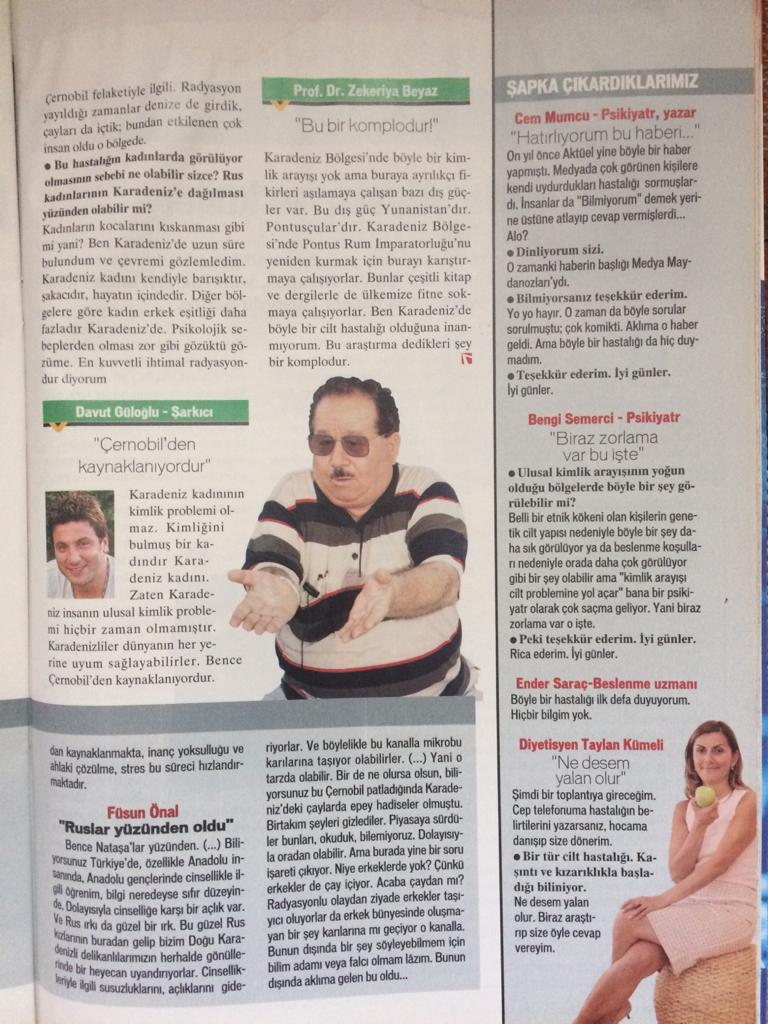“Yıllar önce Aktüel Dergisi’nde şöyle bir haber yaptık. Siyasetten adalete, sosyolojiden teröre her konuda bilirkişi olarak medyada konuşan-yazan 20 kişiye “Karadeniz’de sadece kadınları etkileyen bir hastalıkla ilgili” görüşlerini sorduk. Öyle bir hastalık yoktu, biz uydurduk