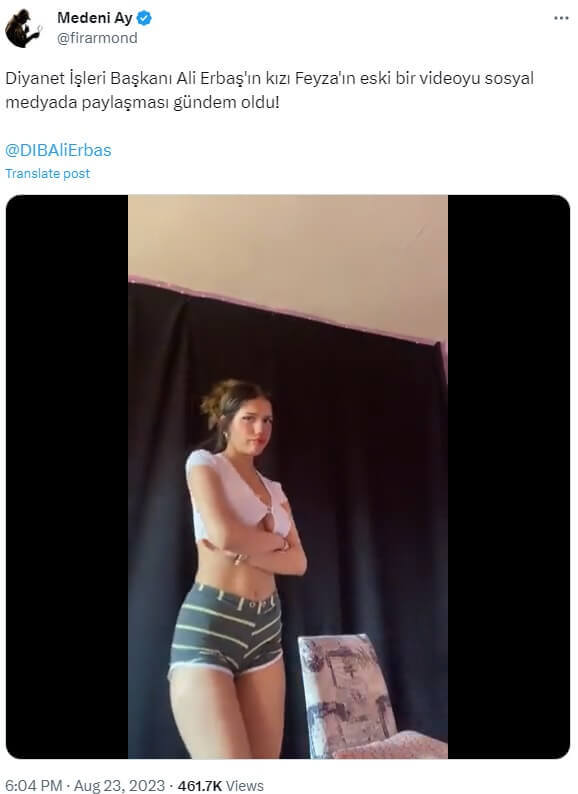 Medeni Ay (@firarmond): “Diyanet İşleri Başkanı Ali Erbaş’ın kızı Feyza’ın eski bir videoyu sosyal medyada paylaşması gündem oldu!”