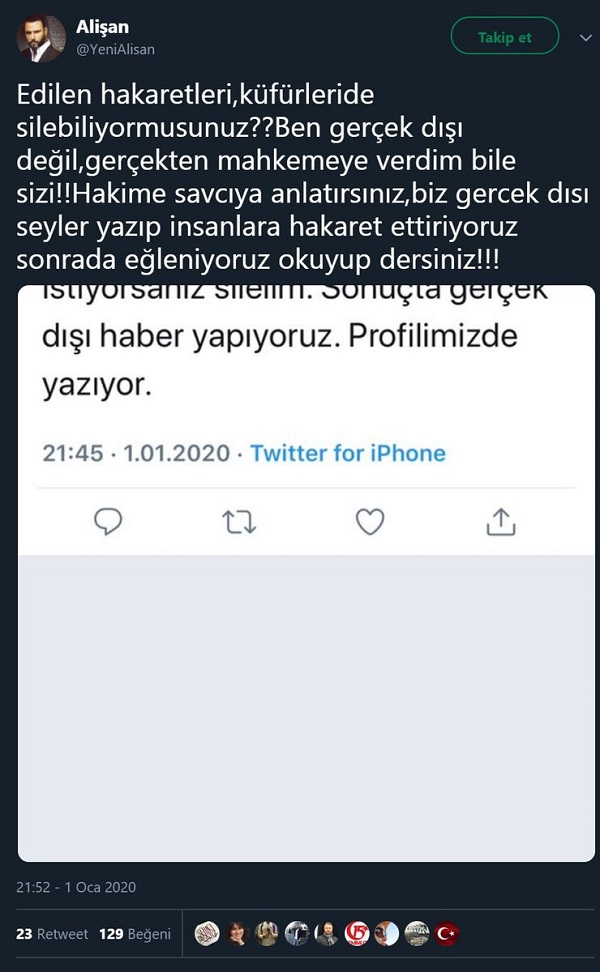 Alişan’ın Twitter hesabından, paylaşımı nedeniyle hakaret yediğini ve adli süreci başlattığını belirtmesinin ardından Vog Magazin’in bahse konu tweetini sildiği görülüyor.