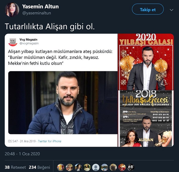 Vog Magazin’in Alişan’ın yılbaşı kutlayanlar için “kâfir, zındık ve hayasız” dediğine yönelik paylaşımı birçok sosyal medya kullanıcısı tarafından gerçek sanılarak Alişan’a tepki gösterilmişti. “Alişan yılbaşı kutlayan müslümanlara ateş püskürdü: “Bunlar müslüman değil. Kafir, zındık, hayasız. Mekke’nin fethi kutlu olsun”” içeriğiyle paylaşılan tweetin ardından yılbaşı geceleri katıldığı konserlere dair ilanları paylaşarak Alişan’ın ikiyüzlülükle eleştirildiği görüldü.