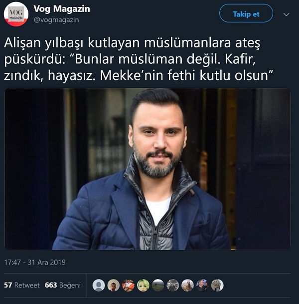Vog Magazin adlı parodi magazin haber profilinin Alişan’ın yılbaşı kutlayanlar için “kâfir, zındık ve hayasız” dediğine yönelik paylaşımı