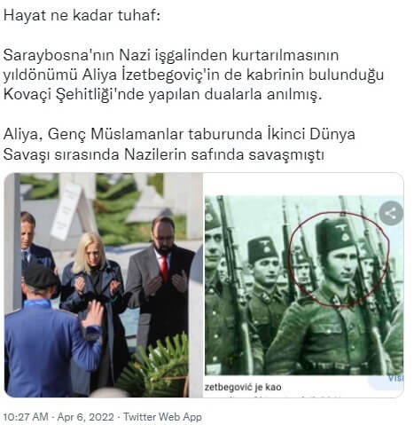 “Hayat ne kadar tuhaf: Saraybosna’nın Nazi işgalinden kurtarılmasının yıldönümü Aliya İzetbegoviç’in de kabrinin bulunduğu Kovaçi Şehitliği’nde yapılan dualarla anılmış. Aliya, Genç Müslamanlar taburunda İkinci Dünya Savaşı sırasında Nazilerin safında savaşmıştı”