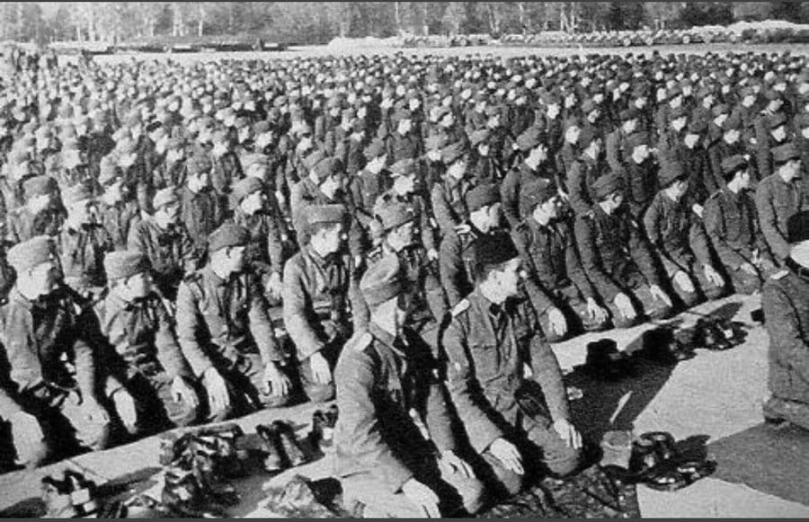 “2.WW, Waffen-SS – Soldiers of the muslim 13. Waffen-SS mountain troop division ‘Handschar’, recruited of volunteers of Bosnia / Hercegovina. Staff-company during military training: Drill exercises. Published in 1943.Vintage property of ullstein bild (Photo by Atlantic-Press/ullstein bild via Getty Images)”