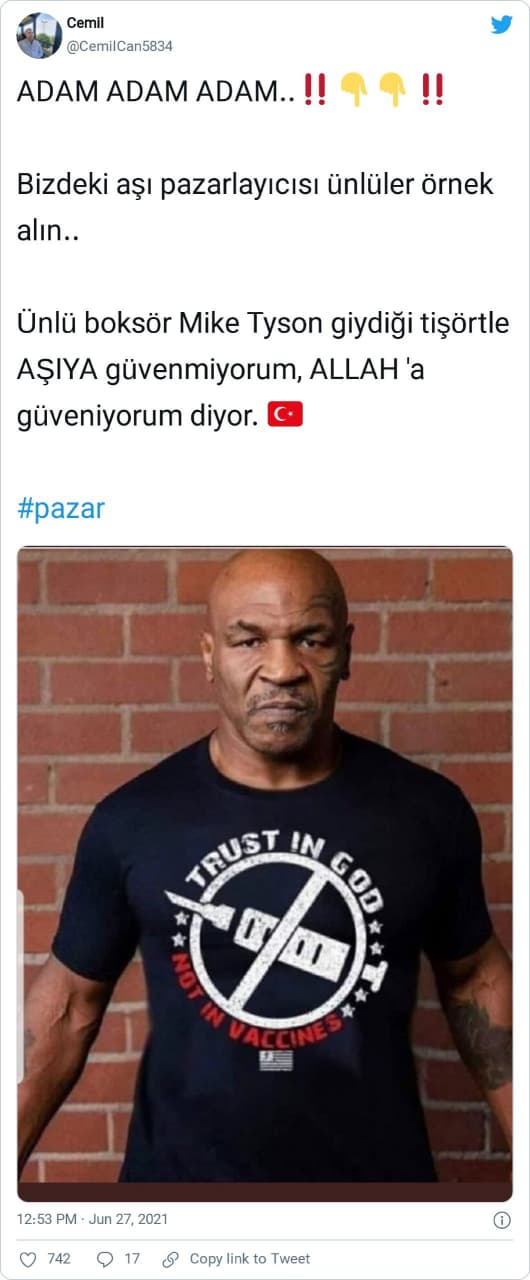 Ünlü boksör Mike Tyson’ın üzerinde “Allah’a inanıyorum, aşıya değil” (“I believe in God, not in vaccines”) yazılı bir t-shirt giydiği iddiasıyla montaj içeren görselin sosyal medyada paylaşıldığına şahit oluyoruz.