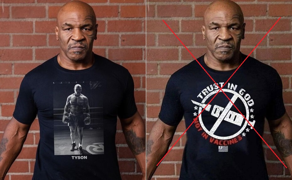 Mike Tyson’ın “Allah’a inanıyorum, aşıya değil” (“I believe in God, not in vaccines”) yazılı bir t-shirt giydiği iddiasıyla paylaşılan montaj içeren fotoğrafın orijinalinde kendi adı ve resmi yer alıyor.