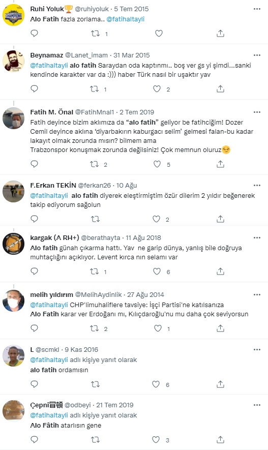 Gazeteci, Habertürk gazetesi yazarı ve Teke Tek adlı programın sunucusu Fatih Altaylı’ya sosyal medyada ve internet forumlarında sıklıkla “Alo Fatih” hitabının yöneltildiğine şahit oluyoruz.