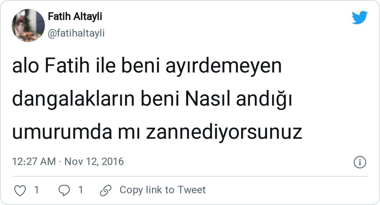 Sosyal medya hesabından yaptığı bir paylaşımda kendisine yönelik “Alo Fatih” atfına “alo Fatih ile beni ayırdemeyen dangalakların beni Nasıl andığı umurumda mı zannediyorsunuz” ifadeleriyle yanıt vermişti.