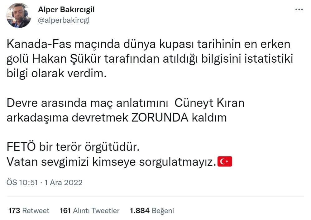 Kanada-Fas maçında dünya kupası tarihinin en erken golü Hakan Şükür tarafından atıldığı bilgisini istatistiki bilgi olarak verdim. Devre arasında maç anlatımını Cüneyt Kıran arkadaşıma devretmek ZORUNDA kaldım FETÖ bir terör örgütüdür. Vatan sevgimizi kimseye sorgulatmayız.