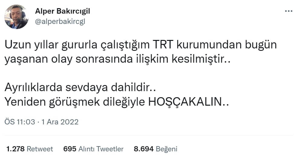 Independent Türkçe: “Sosyal medya hesabından paylaşım yapan Bakırcıgiil, “Uzun yıllar gururla çalıştığım TRT kurumundan bugün yaşanan olay sonrasında ilişkim kesilmiştir… Ayrılıklarda sevdaya dahildir… Yeniden görüşmek dileğiyle hoşçakalın” mesajı paylaştı.”