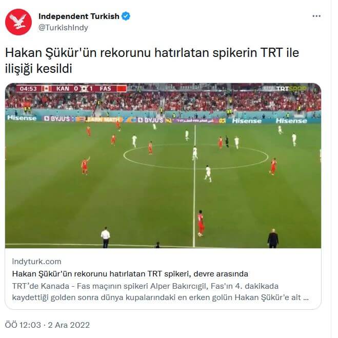 Kanada – Fas Arasında 1 Aralık 2022 Günü Oynana Dünya Kupası Turnuvası Maçını Sunarken Hakan Şükür’ün Attığı En Erken Gole Değinen TRT Spikeri Alper Bakırcıgil’in Yerine Maçın 2. Yarısını Cüneyt Kıran Anlatmış