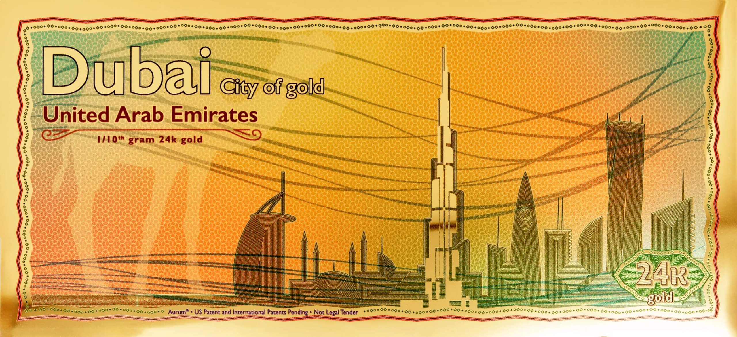 Mücevher endüstrisinde ön plana çıkan Dubai’nin silüetini ve simgesel yapılarını üzerinde barındıran altın banknot görseli şöyle: