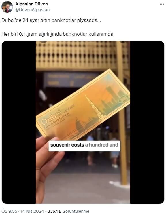 Alpaslan Düven (@DuvenAlpaslan): “Dubai’de 24 ayar altın banknotlar piyasada… Her biri 0.1 gram ağırlığında banknotlar kullanımda.”