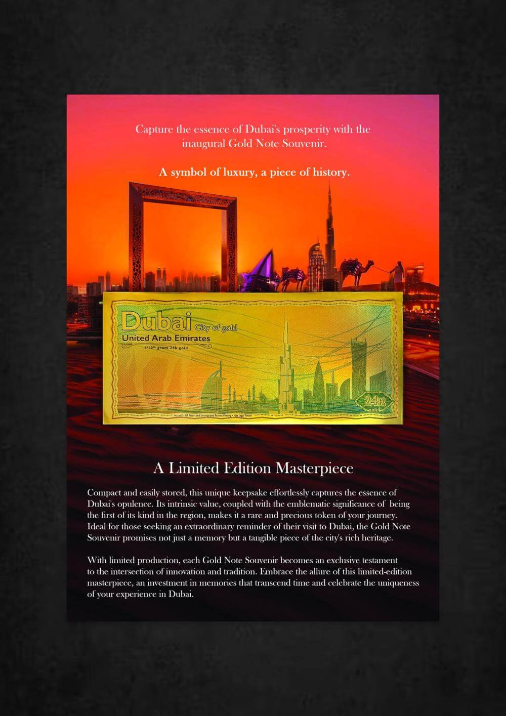 “Yeniliğe olan bağlılığımızın ve zengin altın işçiliği mirasımızın bir kanıtı olan Dubai’nin ilk 24K altın banknot hatırasını tanıtmaktan heyecan duyuyoruz. Amacımız Dubai’nin sakinler ve ziyaretçiler için zamansız bir hatıra sunarken ihtişam.”