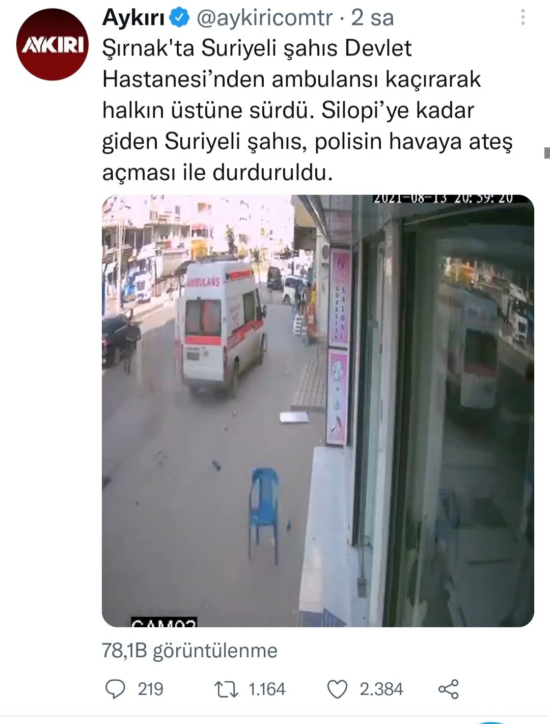 “Şırnak’ta ambulans çalan kişi Suriyeli değil siirtli Ferhat. Kurtalanda yaşayan 28 yaşındaki Ferhat’ın B. ailesi 3 gün önce kayıp başvurusu var. Mültecileri bu bahane üzerinden hedef göstermek ayrıca ırkçılıığınızın göstergesi.”