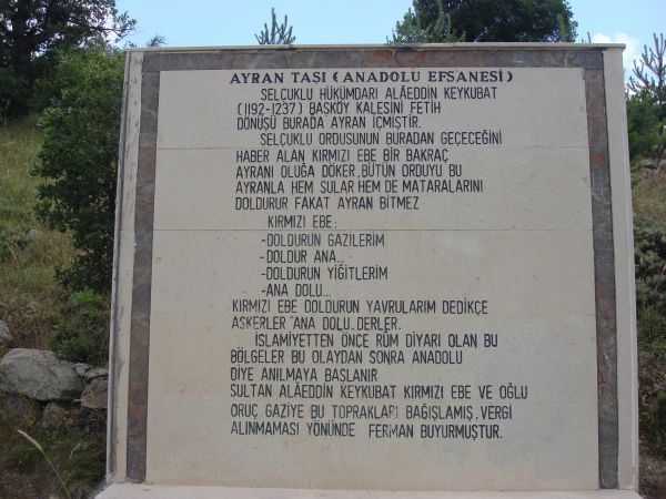 "Anadolu isminin nereden geldiğine dair bazı tarihçiler şöyle bir efsane anlatırlar. Anadolu Selçuklu hükümdarı Alaeddin Keykubat Başköy kalesinin fethinden dönerken Ankara Kızılcahamam yakınlarında Taşlıca köyüne uğrayarak burada ayran içmiştir. Ordunun buraya uğrayacağını haber alan kırmızı ebe adlı yaşlı bir ninemiz ayran taşına bir bakraç ayran doldurur ve askerler gelince hem ayrandan içerler hem de mataralarını ayran ile doldurur ve ninemiz her seferinde doldurun evlatlarım dedikçe askerler de ana dolu derler ordunun tüm askerleri bu bir bakraç ayrandan hem içer hem de mataralarını doldurması ve ayranın hiç bitmemesi Sultan Alaeddin Keykubat’ın kulağına gider ve o tarihten beridir bu diyarlar Anadolu diye anılarak günümüze gelir."