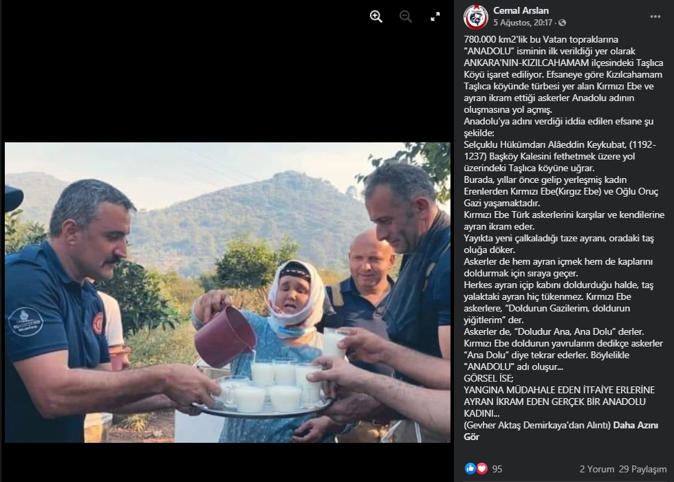 2021 yılı 29 Temmuz – 6 Ağustos arasında güney illerimizde yaşanan ve üzücü kayıplara yol açan orman yangınlarına müdahale eden görevlilere ayran ikram eden kadının görüntülendiği fotoğraf karesi de “Anadolu isminin ayran ikram eden ana”ya dayandığı hurafesiyle birlikte servis edilmişti.