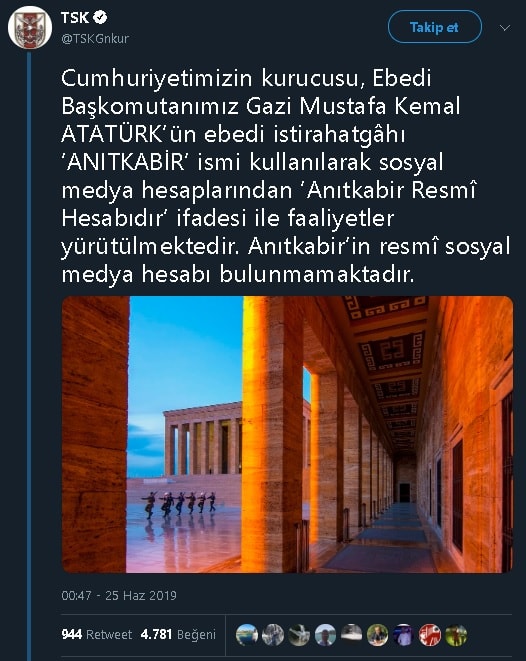 “Cumhuriyetimizin kurucusu, Ebedi Başkomutanımız Gazi Mustafa Kemal Atatürk’ün ebedi istirahatgahı ‘Anıtkabir’ ismi kullanılarak sosyal medya hesaplarından ‘Anıtkabir Resmi Hesabıdır’ ifadesi ile faaliyetler yürütülmektedir. Anıtkabir’in resmi sosyal medya hesabı bulunmamaktadır.”