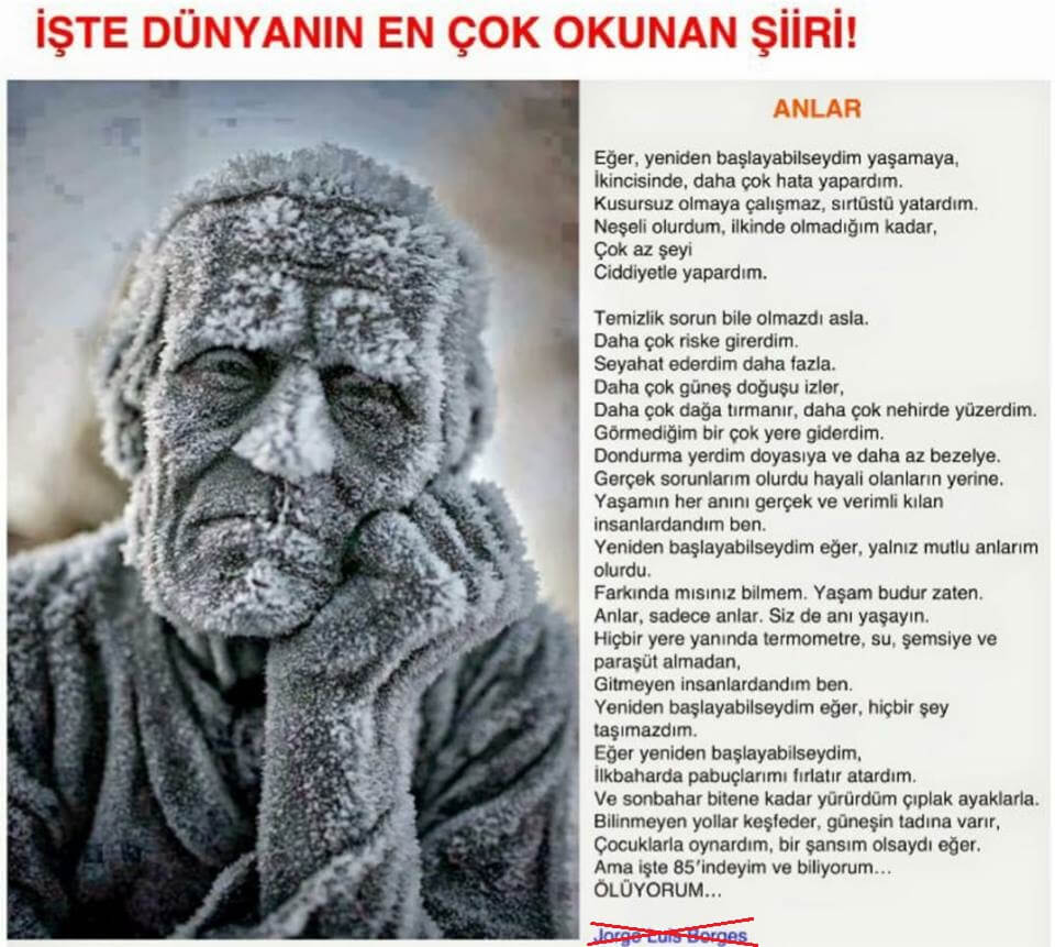 “Eğer, yeniden başlayabilseydim yaşamaya,/ İkincisinde, daha çok hata yapardım./ Kusursuz olmaya çalışmaz, sırtüstü yatardım./ Neşeli olurdum, ilkinde olmadığım kadar,/ Çok az şeyi/ Ciddiyetle yapardım./ Temizlik sorun bile olmazdı asla./ Daha çok riske girerdim./ Seyahat ederdim daha fazla…” şeklinde akan giden “Anlar” başlığıyla bilinen ve Jorge Luis Borges’e ait SANILAN şiire aşina olabilirsiniz.