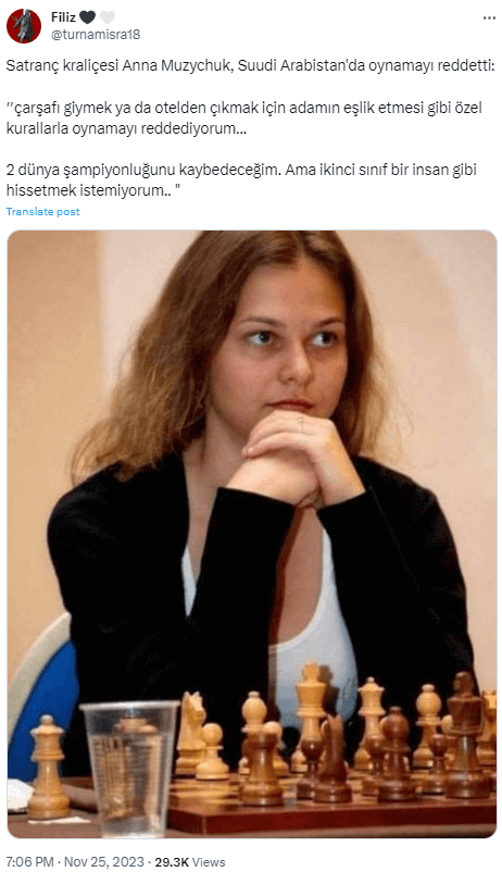 Filiz (@turnamisra18): “Satranç kraliçesi Anna Muzychuk, Suudi Arabistan’da oynamayı reddetti: ′′çarşafı giymek ya da otelden çıkmak için adamın eşlik etmesi gibi özel kurallarla oynamayı reddediyorum… 2 dünya şampiyonluğunu kaybedeceğim. Ama ikinci sınıf bir insan gibi hissetmek istemiyorum.. “”