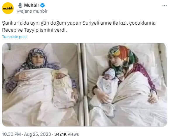 Muhbir (@ajans_muhbir): “Şanlıurfa’da aynı gün doğum yapan Suriyeli anne ile kızı, çocuklarına Recep ve Tayyip ismini verdi.”