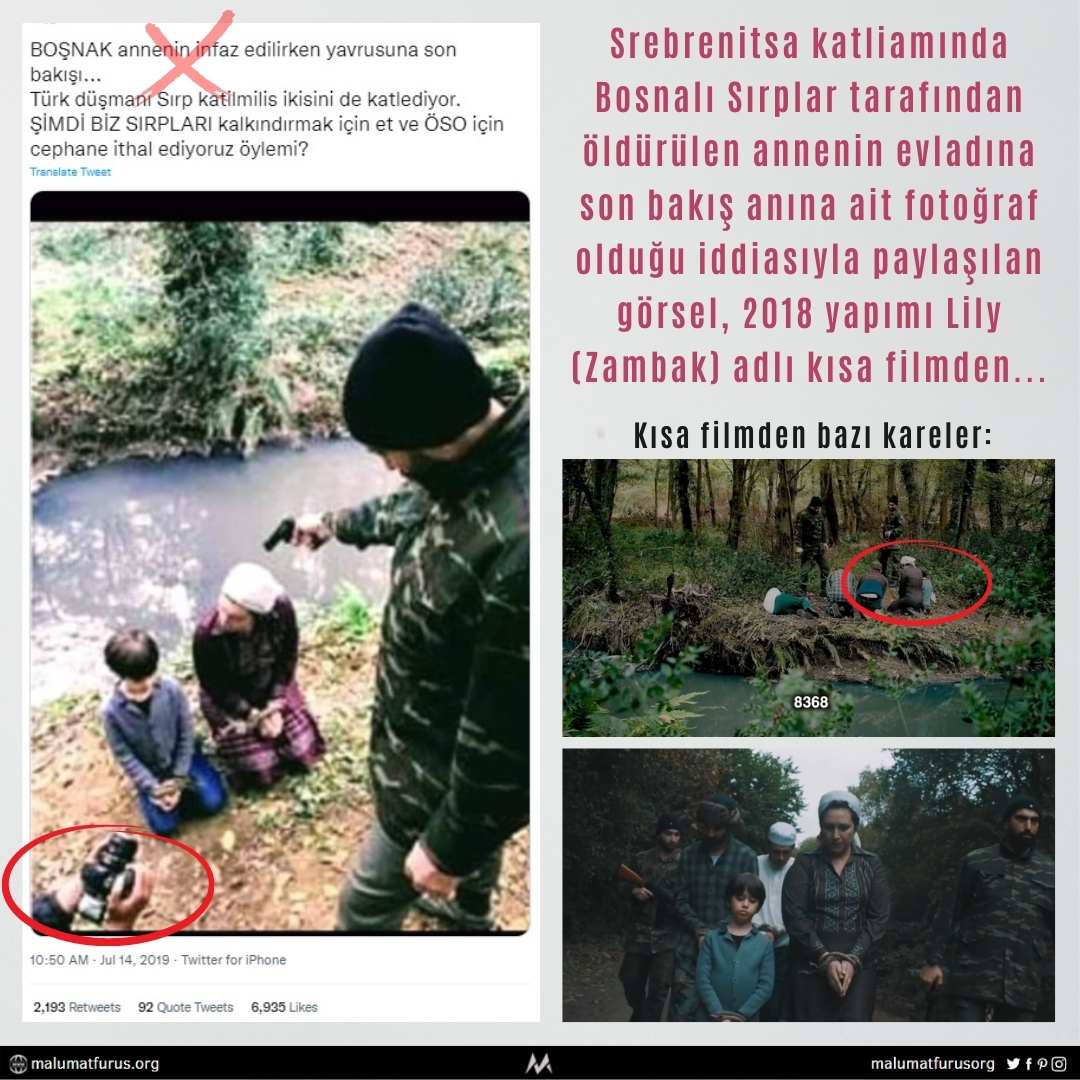 Boşnak bir annenin 1995 yılında Sırplar tarafından katledilmeden önce evladına son bakışını yansıttığı iddiasıyla paylaşılan görsel, Srebrenitsa Soykırımını konu edinen 2018 yapımı 4 dakikalık “Lily” (“Zambak“) adlı kısa filmden bir sahne.